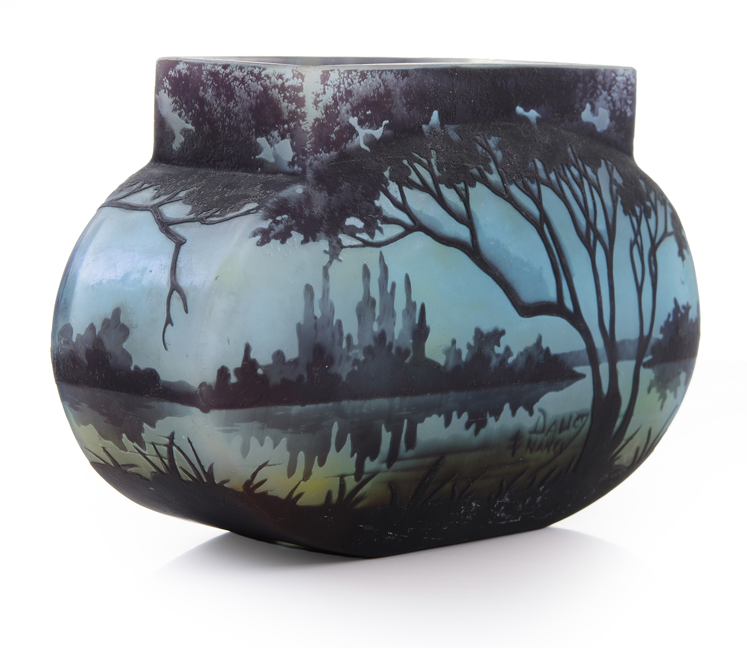 Robust in form, finely carved with a winter landscape scene on a blue celeste ground, signed Daum Nancy to side with the Cross of Lorraine
