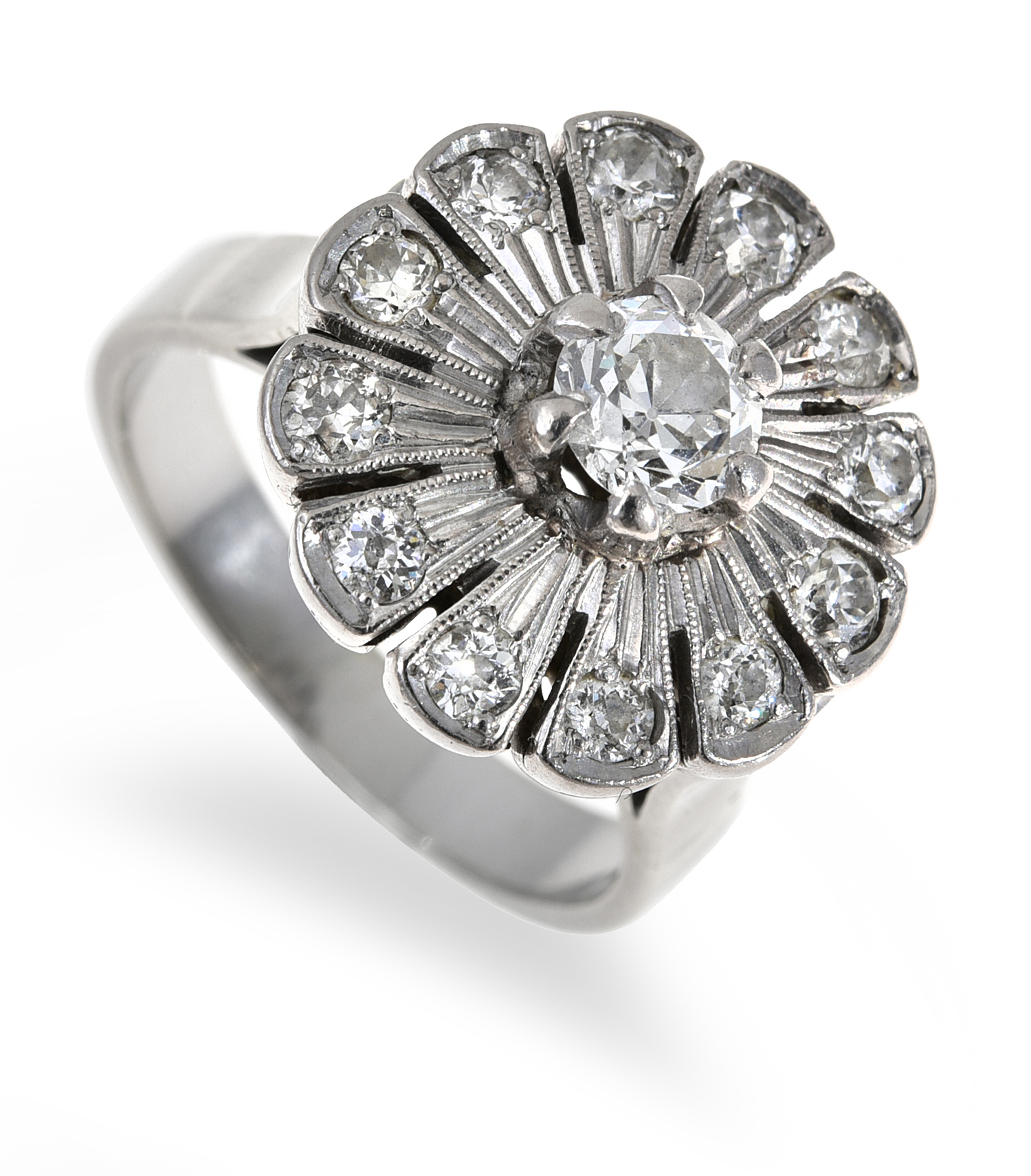 The pierced foliate cluster, centrally set with an old cut diamond with further diamonds to the etched petals totalling 1.00ct, mounted in 18ct white gold and palladium, ring size R.