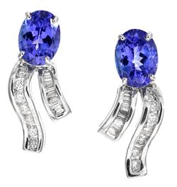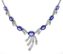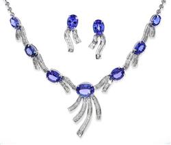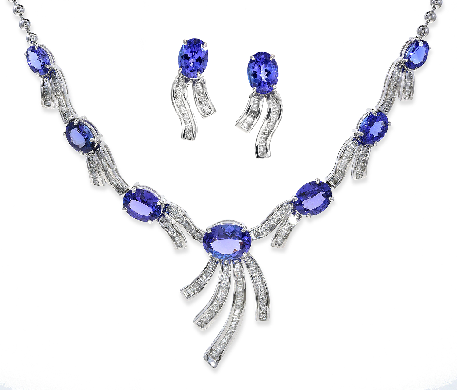 Including a necklace comprising seven oval cut tanzanite totalling 16.4cts, and round brilliant and baguette cut diamonds totalling 2.8cts, total length 440mm, with a pair of conforming earrings, all mounted in 18ct white gold.