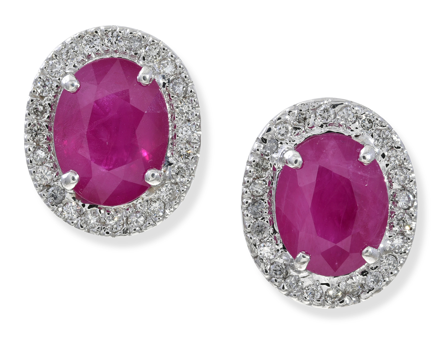 Each earring centrally set with an oval cut ruby of 2.27cts, having round brilliant cut diamonds set to the surround, mounted in 18ct white gold.