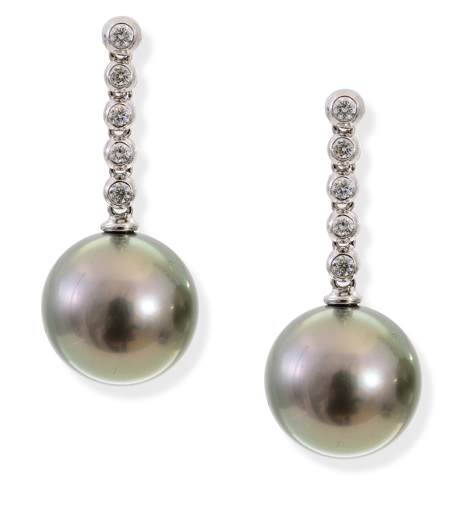 Each comprising a round pearl of grey, blue and purple hues measuring 12.2mm, suspended from five round brilliant cut bezel set diamonds, set in 18ct white gold.