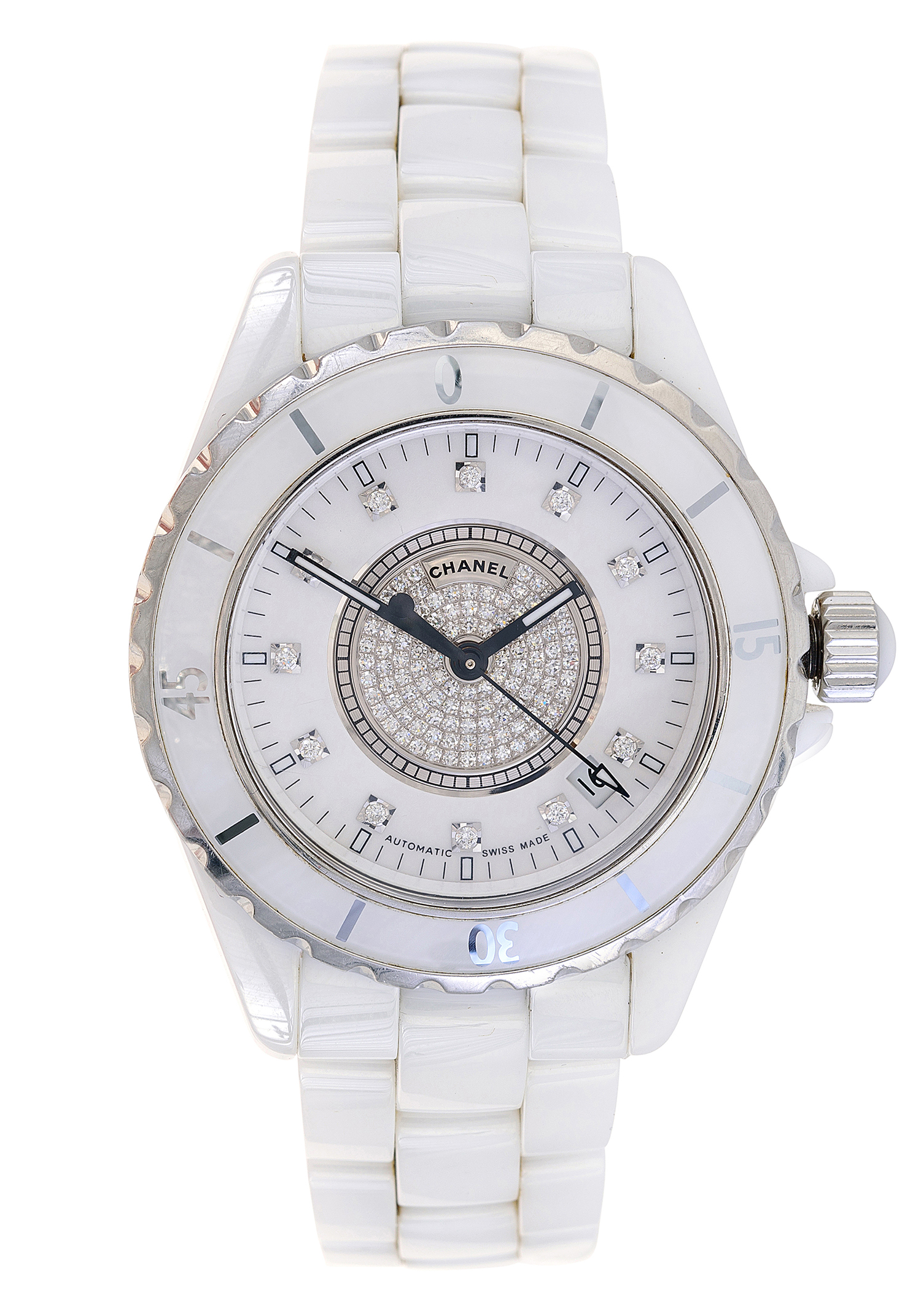 Automatic movement, circular white and diamond set dial with diamond numerals, date aperture between four and five, signed case dial and movement, white ceramic case with conforming ceramic bands, total length 180mm, 40mm diameter.