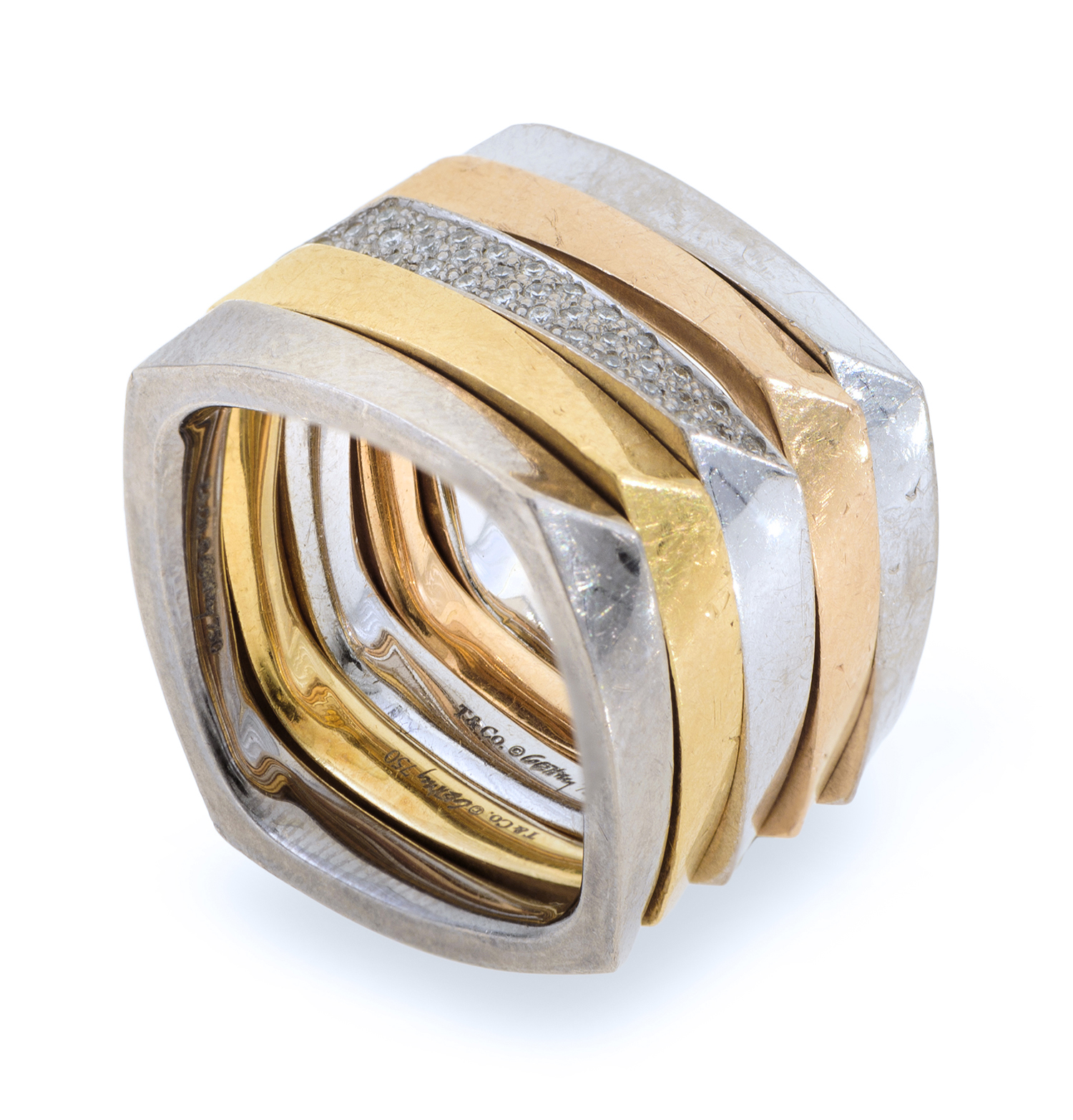 From the Frank Gehry Torque collection, comprising a diamond pave set ring in 18ct white gold, two further rings in 18ct white gold, a ring in 18ct rose gold and one in 18ct yellow gold, signed, ring size O.