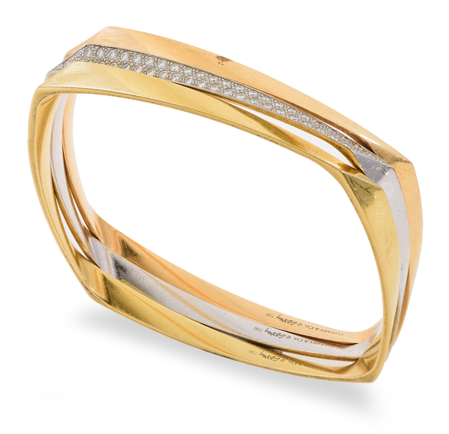 From the Frank Gehry Torque collection, comprising a diamond pave set bangle in 18ct white gold, with two plain bangles in 18ct yellow and rose gold, signed, 60mm diameter.