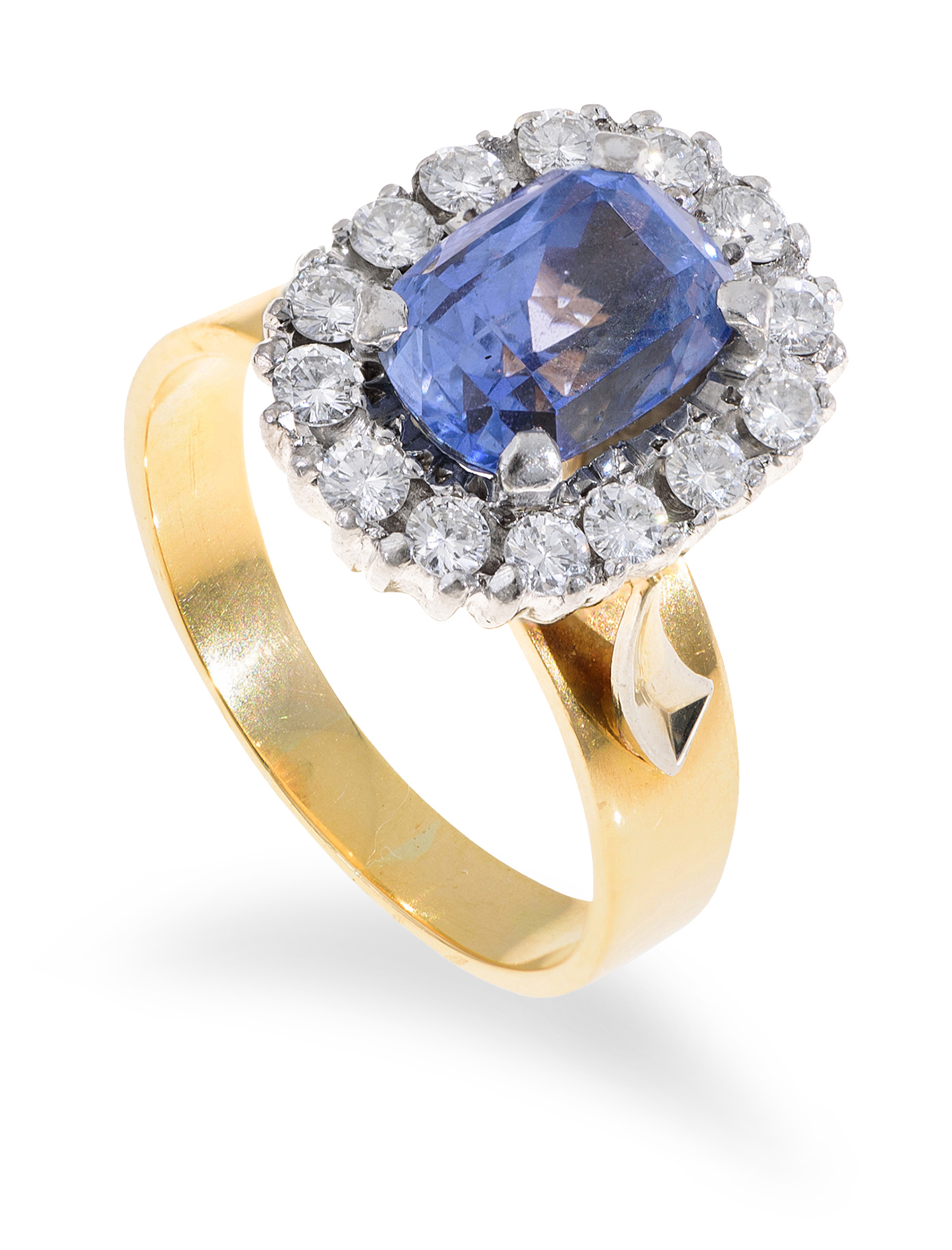 The cushion cut sapphire of 3.15cts, surrounded by round brilliant cut diamonds totalling 0.70cts, mounted in 18ct gold, ring size N.