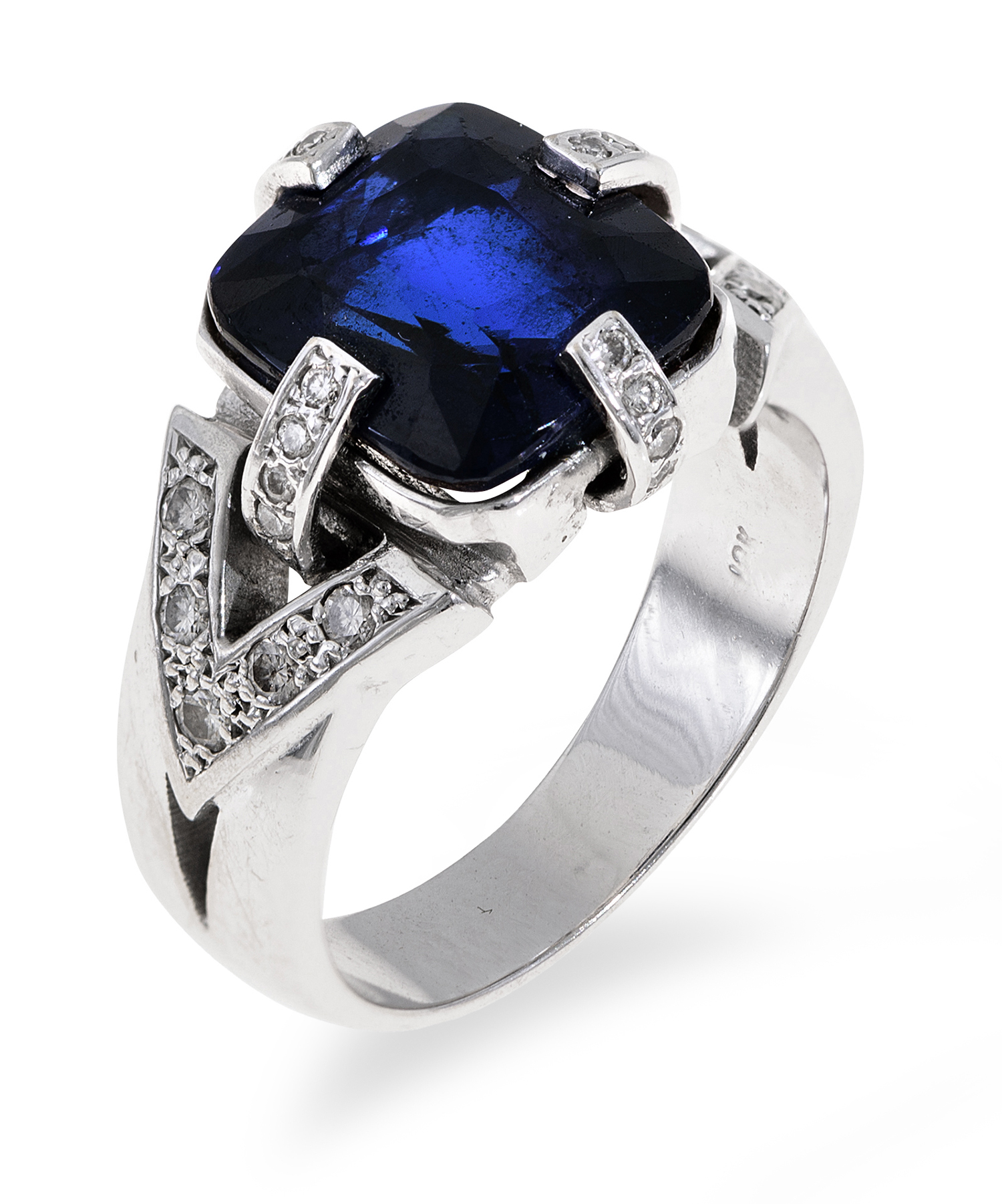 Comprising a cushion cut sapphire of 5.50cts, with diamond detail to the claws and shoulder, hand crafted in 18ct white gold, ring size O.