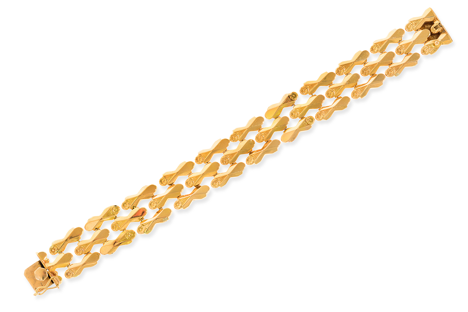 The articulated fancy link bracelet with floral motifs, modelled in 18ct gold, total length 200mm.