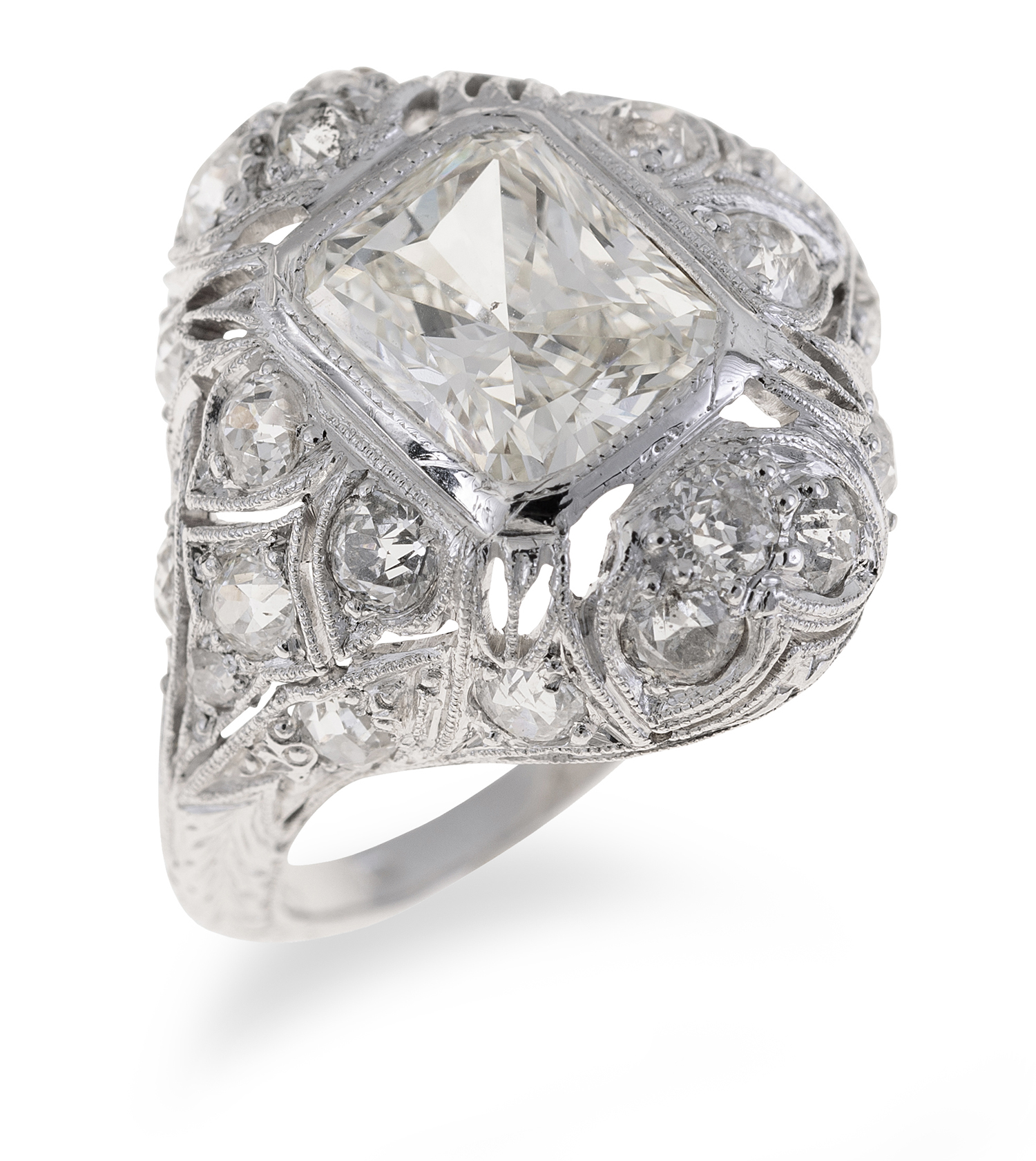 Centrally set with a radiant cut diamond of 1.66cts, having a pierced and domed frame set with old European cut diamonds, mounted in platinum, ring size J.