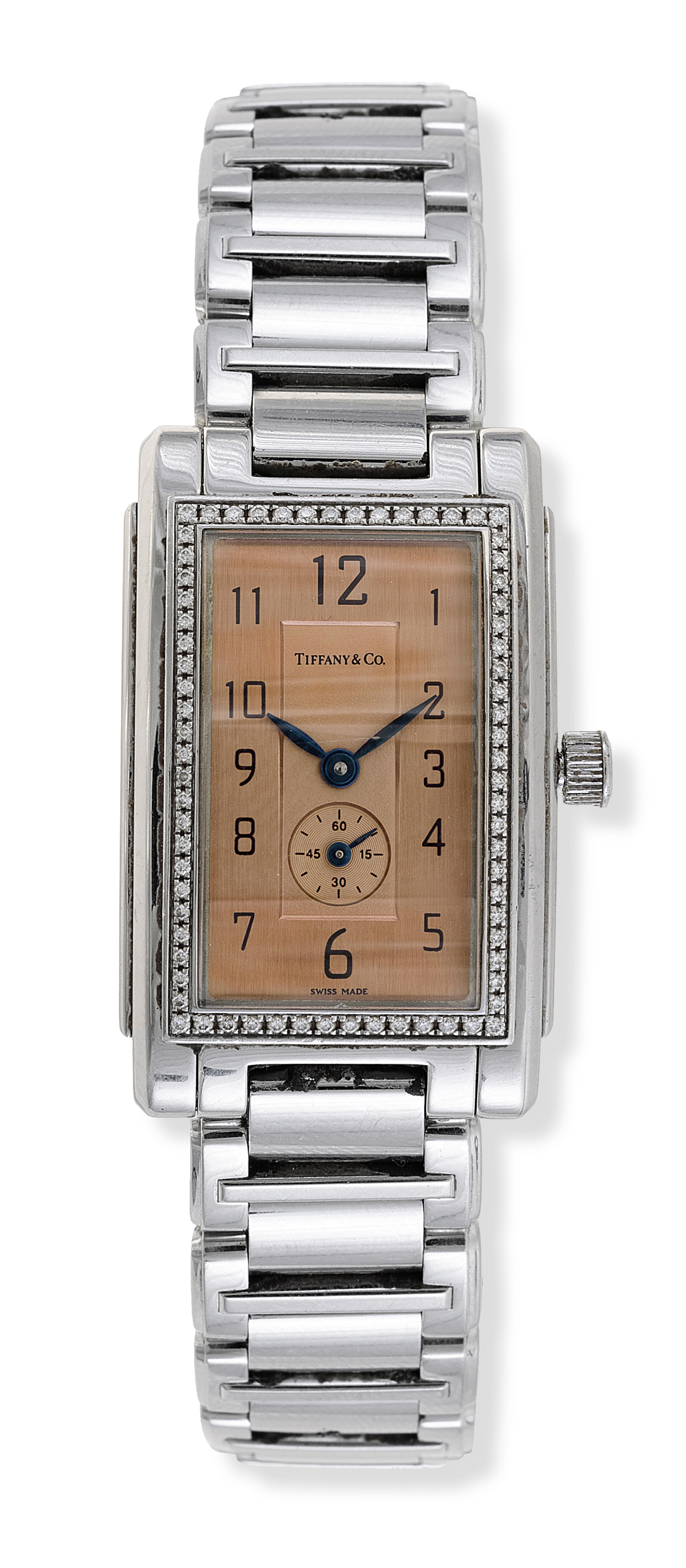Quartz movement, rectangular coppered dial with Arabic numerals, subsidiary seconds dial at six, signed case, dial and movement, stainless steel case with diamond set bezel to stainless steel bracelet bands, case reference 040260722, total length 180mm, case length 30mm, boxed with two extra links.