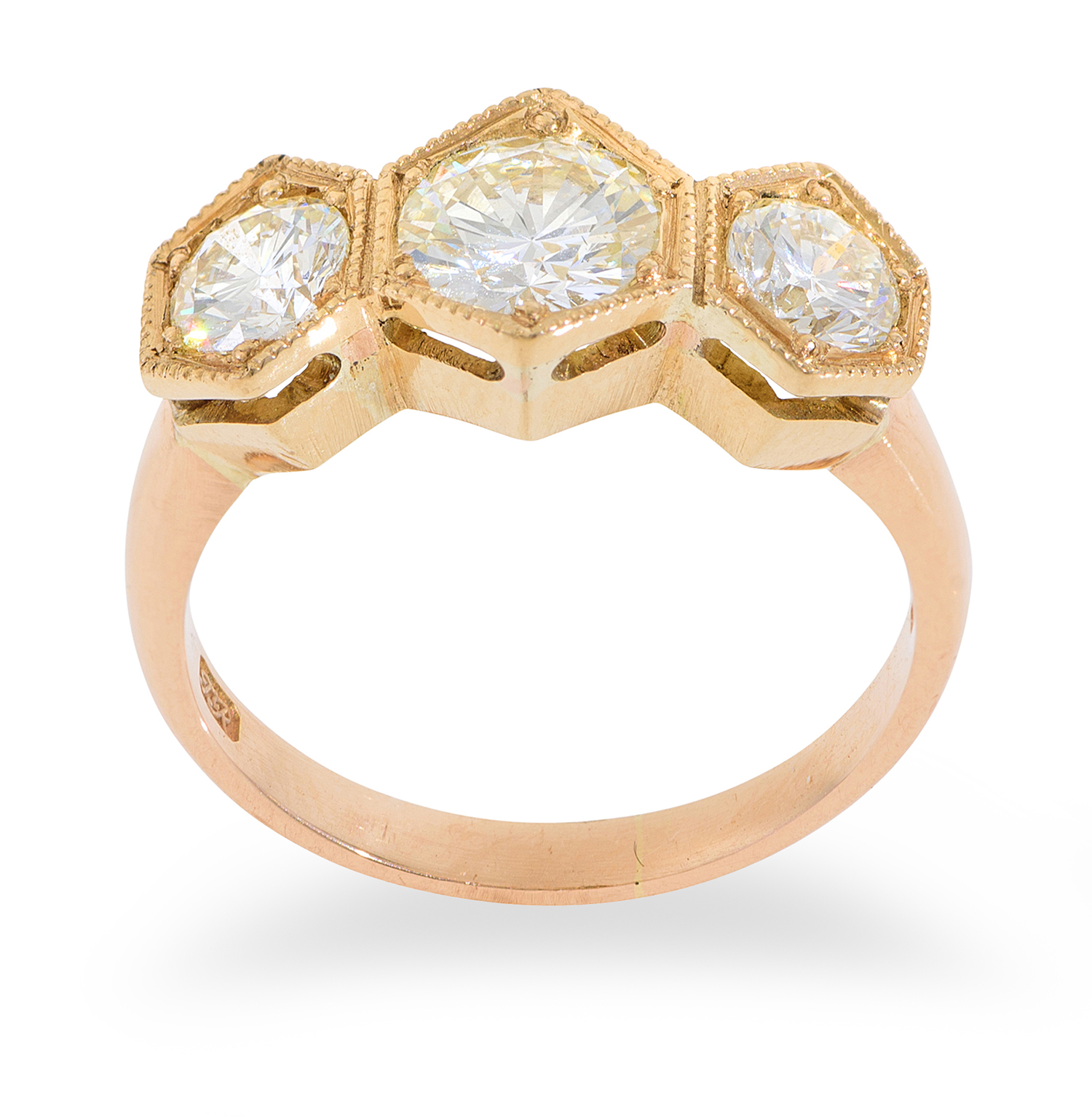Centrally set with a round brilliant cut of 1.00ct, flanked by round brilliant cut diamonds totalling 2.16cts, mounted in 18ct gold, ring size O.