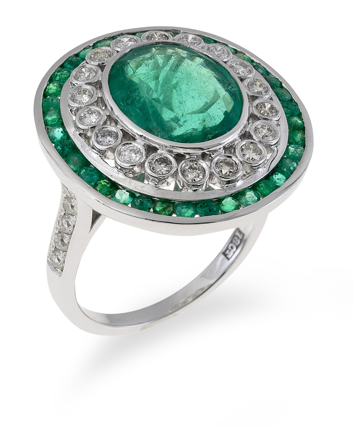 Centrally set with an oval cut emerald of 3.83cts, surrounded by collet set diamonds totalling 0.62cts and bordered by channel set emeralds, mounted in 18ct white gold, ring size N.