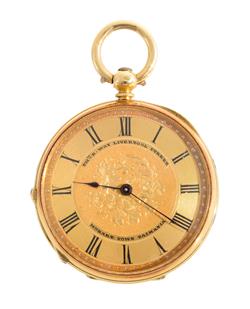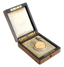 Key wind and set movement, circular gold dial with Roman numerals, signed dial, movement and curvet , Thos. B. Way Liverpool Street Hobart Town Tasmania, case signed G. Chopard, 18ct gold case, 33mm diameter, with original inlaid Tasmanian wooden box.
