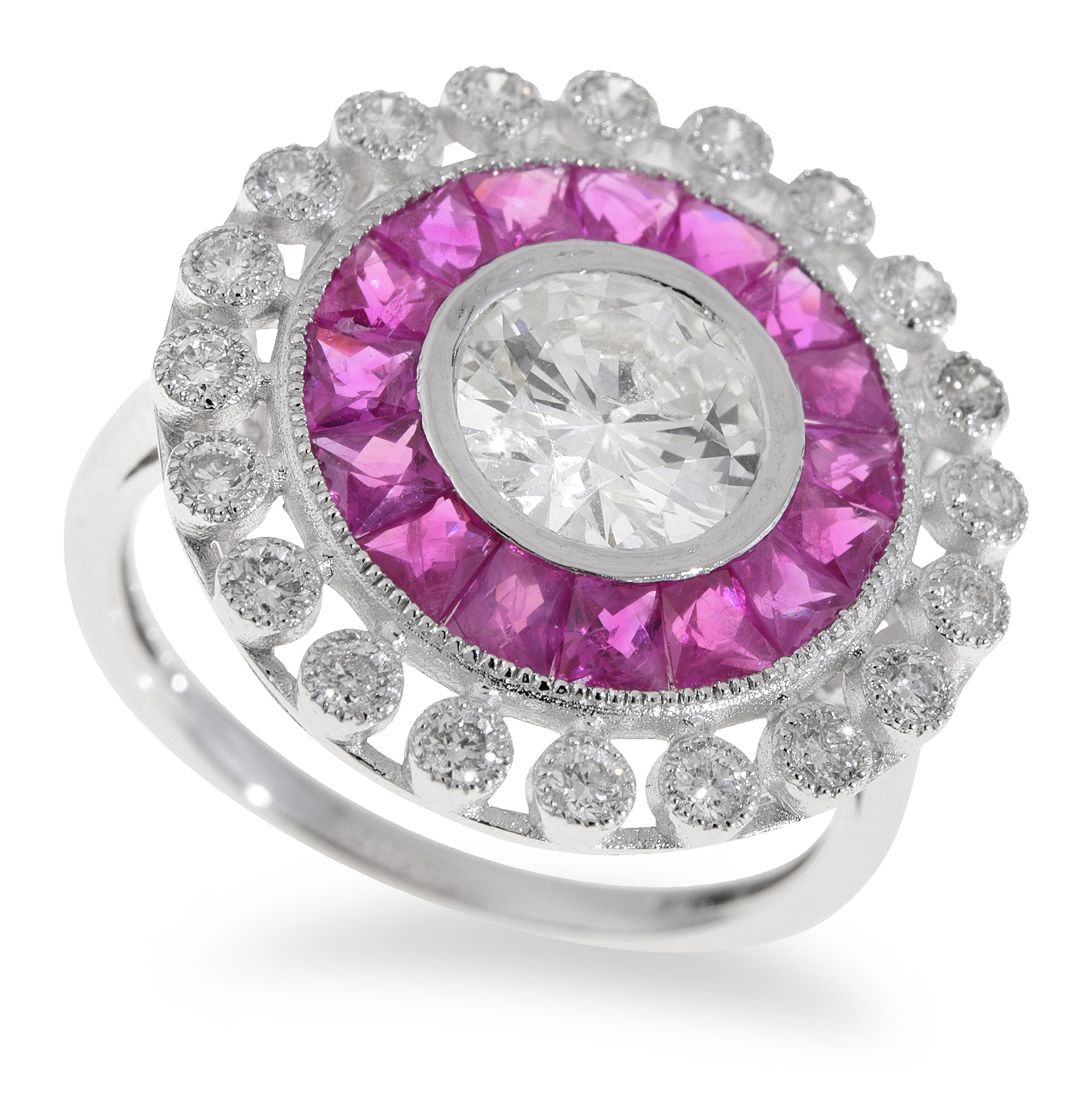 Centrally set with a round brilliant cut diamond of 1.00cts, surrounded by carre cut rubies and round brilliant cut diamonds, mounted in 18ct white gold, ring size L.