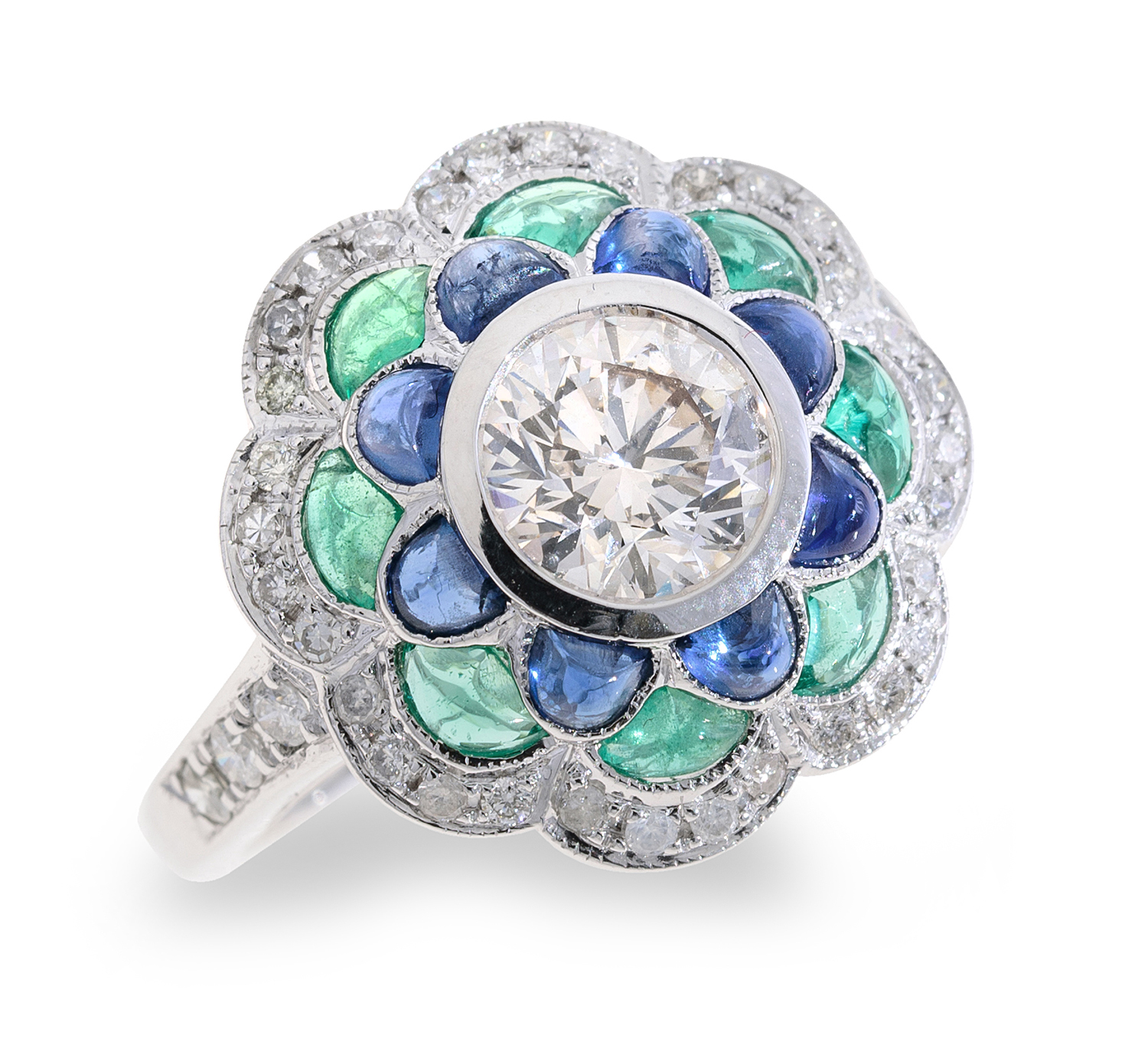 Centrally set with a round brilliant cut diamond of 1.01cts, surrounded by sapphires and emeralds cut en cabochon, with further diamonds to the shoulders and surround, mounted in 18ct white gold, ring size M.