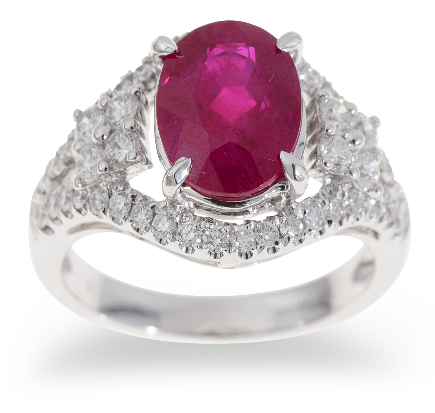 Centrally set with an oval cut ruby of 2.86cts, surrounded and shouldered by round brilliant cut diamonds totalling 0.50cts, mounted in 18ct white gold, ring size L. Accompanied by a GSL report stating origin Burma.