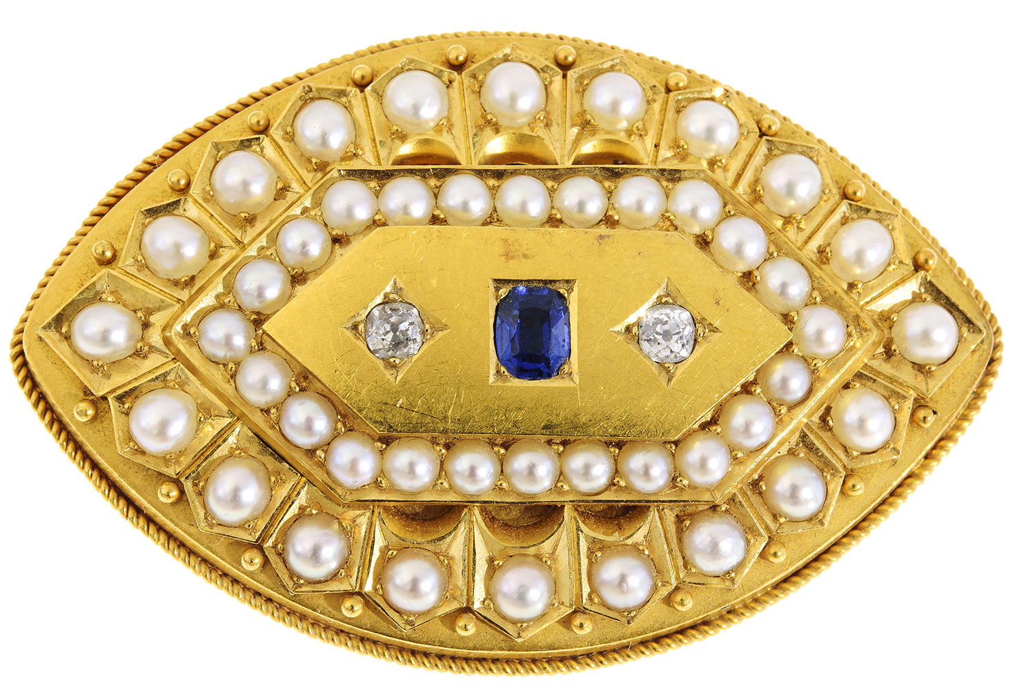 The lozenge shaped brooch centred with an oval cut sapphire and flanked by old European cut diamonds, with seed pearls to the surround, mounted in 18ct gold.