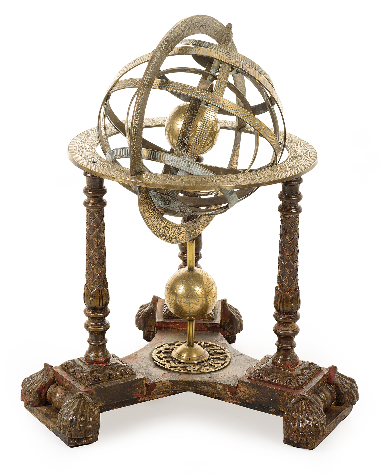 The brass bands modelling the circular orbits of the planets revolving around the Earth, all mounted on a polychrome turned wood stand,