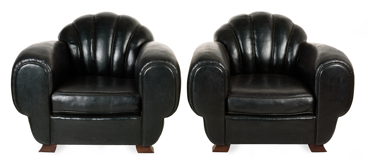 Overall condition good. Minor scuffs and holes visible to upholstery on both. Inconsistencies to spring upholstery in places.