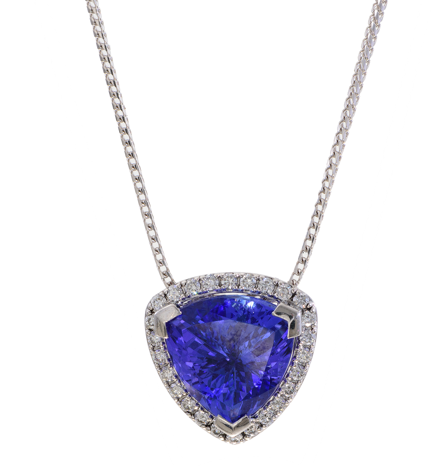 Comprising a trilliant cut tanzanite of 6.86cts, surrounded by round brilliant cut diamonds totalling 0.39cts, mounted in 18ct white gold, to a conforming chain, total length 480mm.