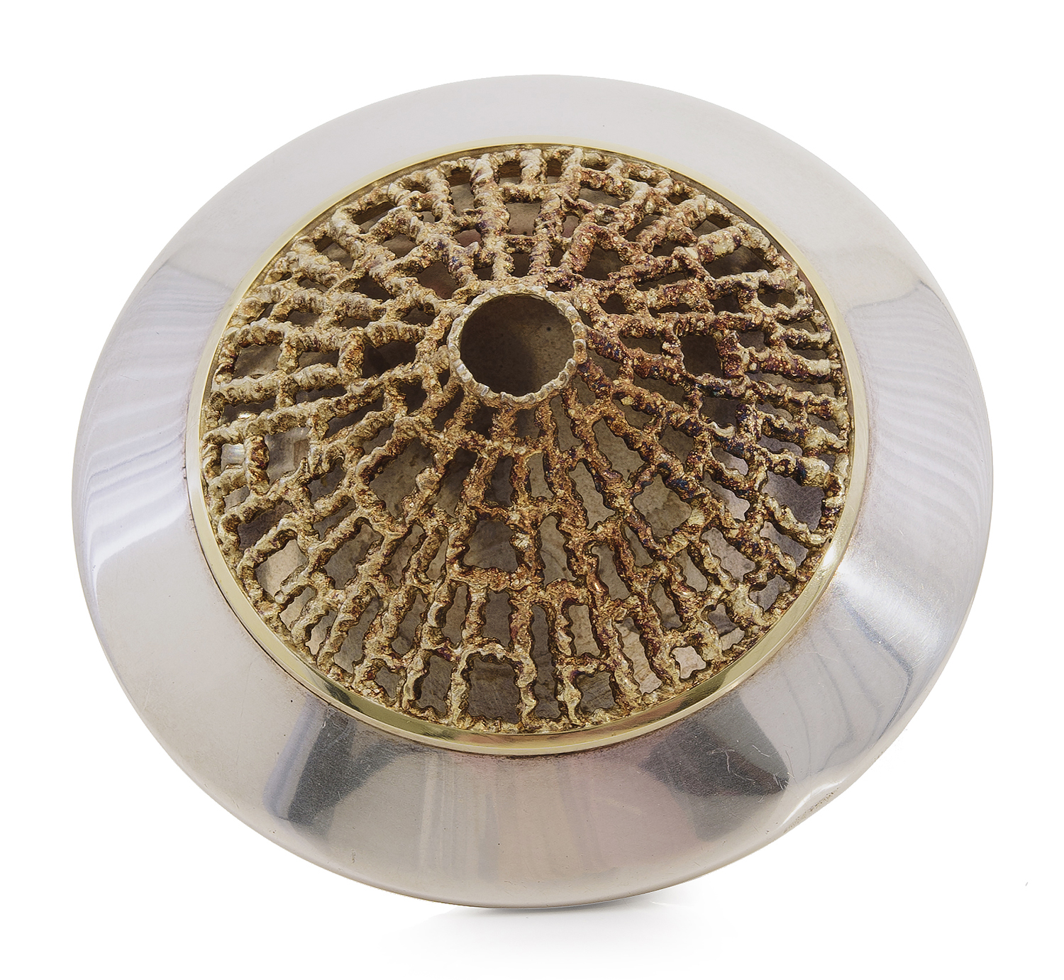 Compressed in form with a tapering pierced and gilded rim, 6.5cm high