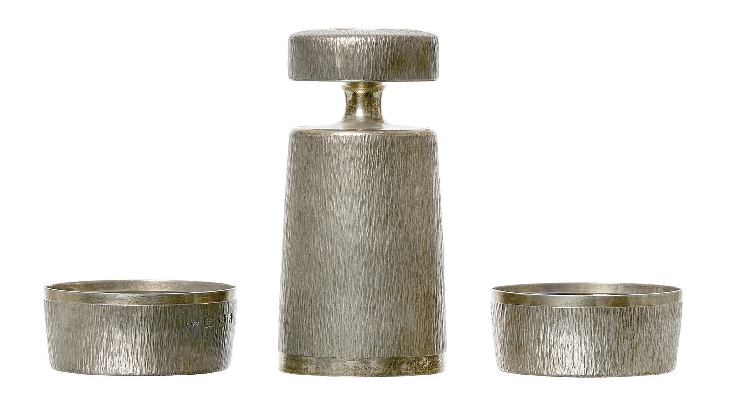 Of cylindrical form with bark textured surface lifted from a polished band, the dishes with glass inserts, weighted (3)