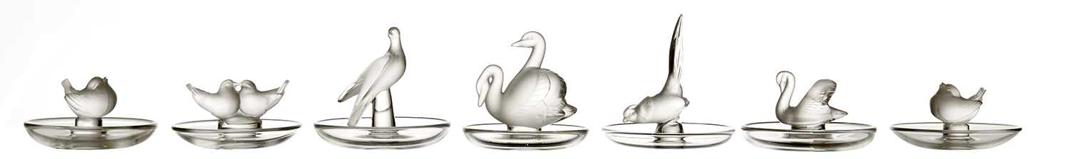 Depicting various birds, all baring a form of lalique signature, each 10cm diameter (7)