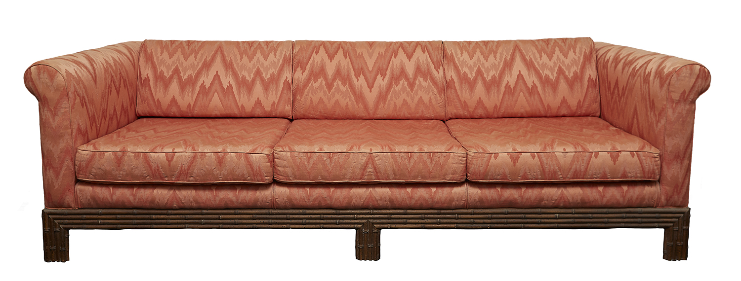A GOOD QUALITY FOUR SEATER SETTEE WITH BAMBOO MOLDED FRAME IN IKAT CORAL SILK JACQUARD