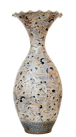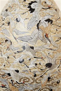 of baluster shape with scalloped rim, One Thousand Crane design Senbazuru. Enamelled decoration of flying cranes over a cloud background in sprays of gold. The base with a design of stone paving, 81cm high