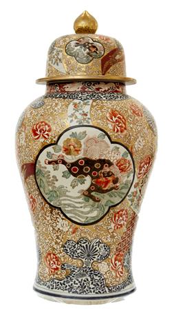 of baluster shape, the central cartouche theme of Botan-shishi or Peony and Shishi (Foo Dog), a traditional decorative theme in Japanese art seen as symbolic of nobility and authority. The background in a combination of scrolling grasses and flowers in both underglaze blue and overglaze gold enamel. Cover with continuing theme and tama (buddhist pearl) finial, 86cm high