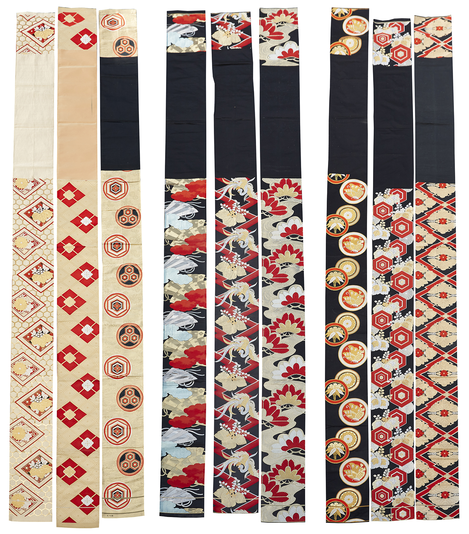 Group of ten Obi (Sash for Kimono) featuring various designs, tortoise shell pattern for long life, family crests, for use in wedding ceremonies. (9)