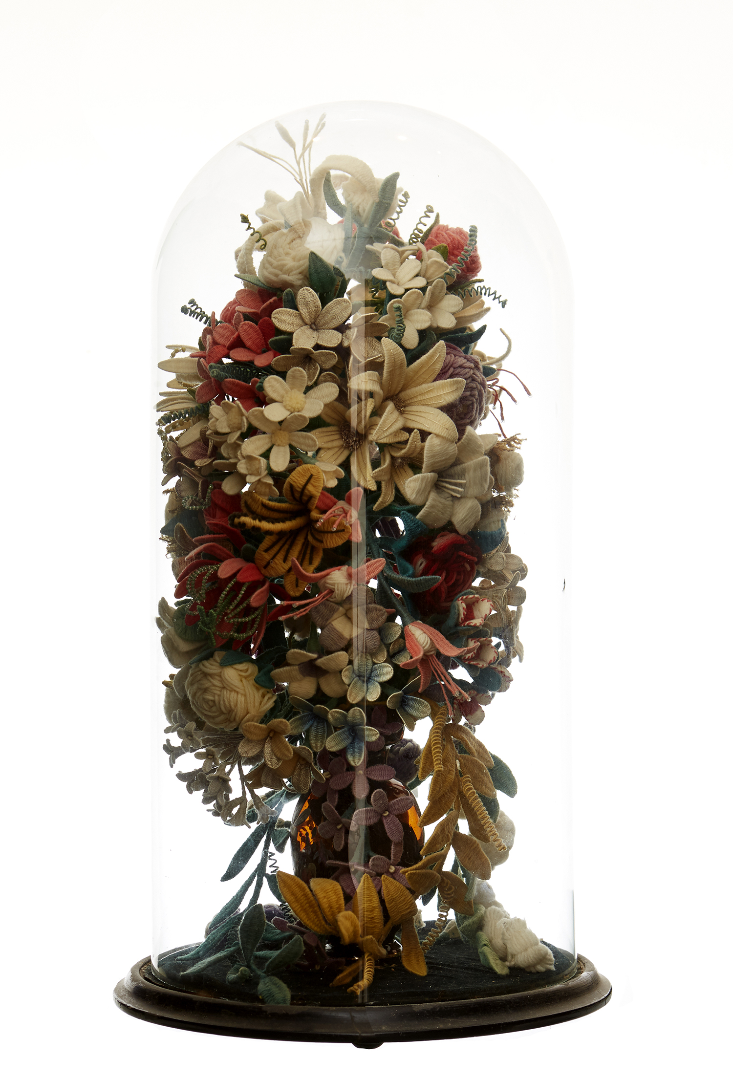 A VICTORIAN ARRANGEMENT OF BERLIN WOOLWORK FLOWERS UNDER A GLASS DOME