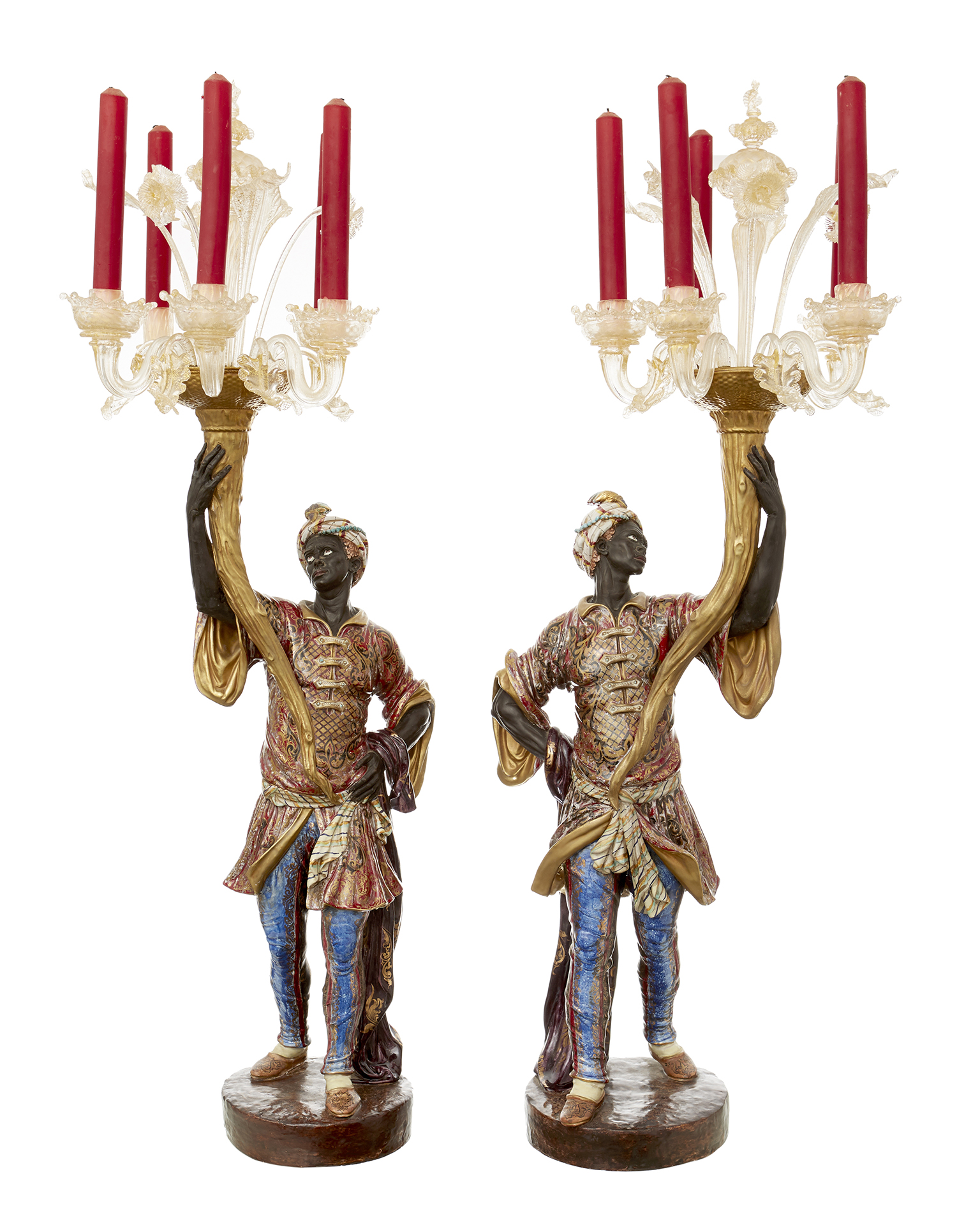 Hand painted and gilded ceramic, the Venetian glass branches with gilded inclusions, including finial 120cm high