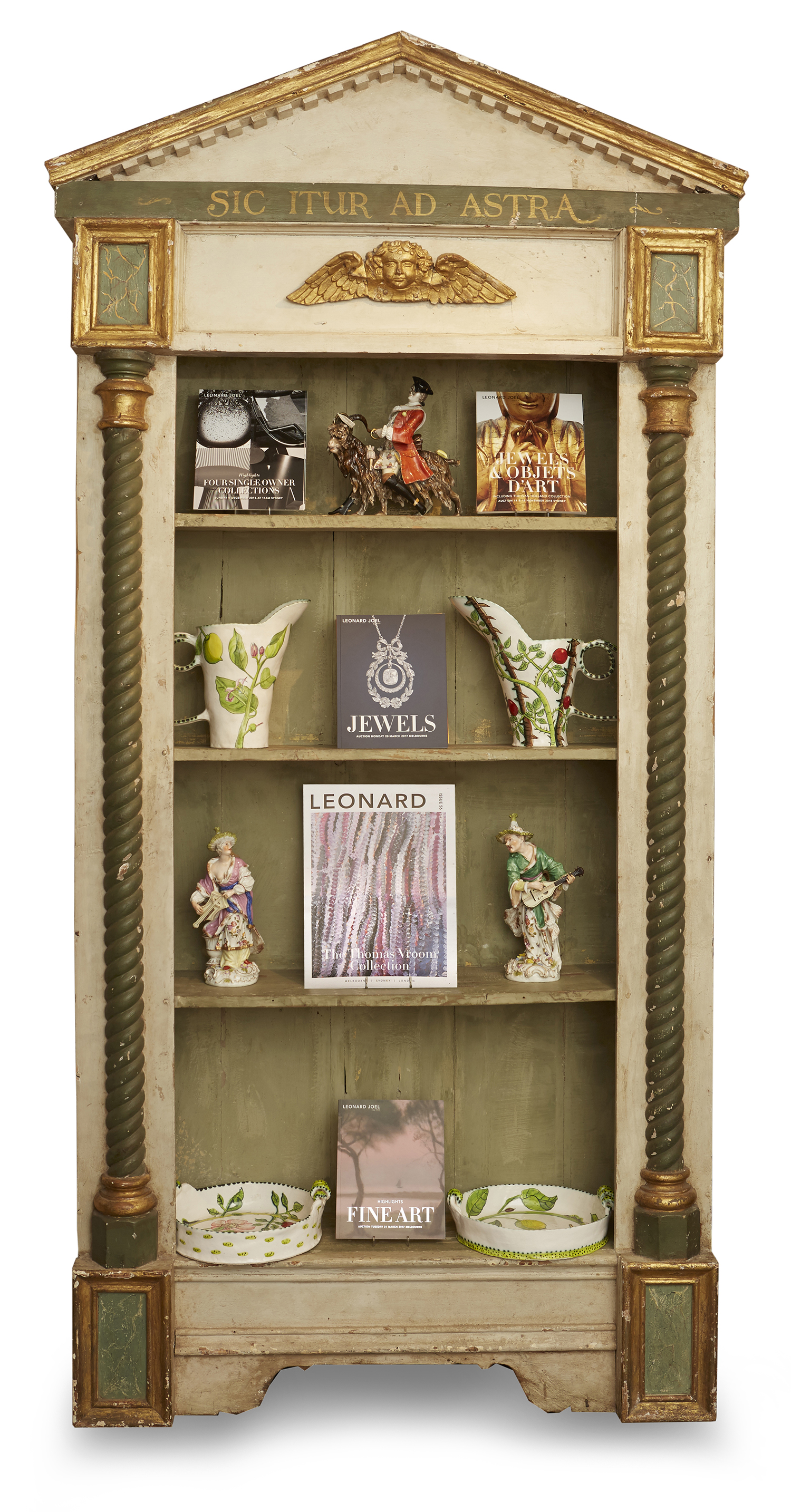 Of classical architectural form with Latin inscribe open pediment above open shelves flanked by columns, 260x 130 x 32cm
