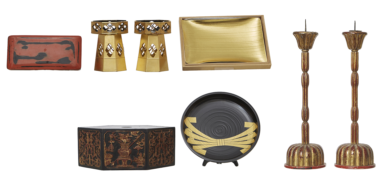 Including a pair of torcheres of small proportions, two joss stick holders, a finely carved platform, three trays and a gilt dish (8)