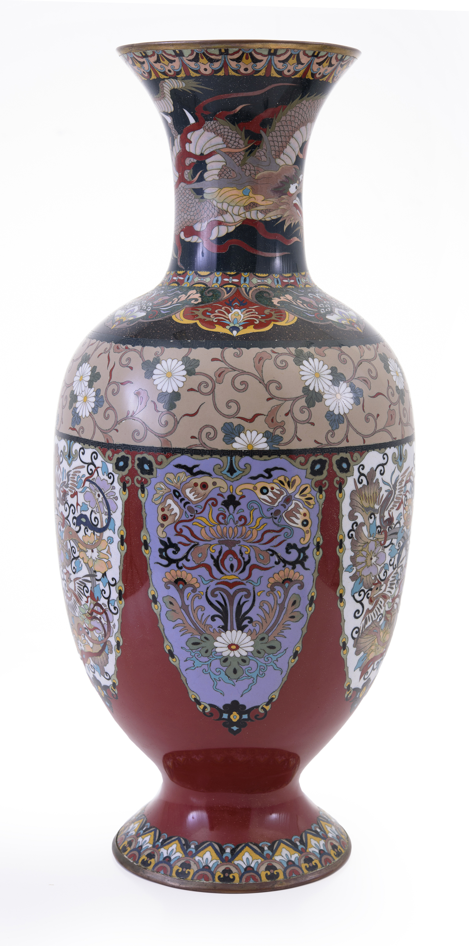 The body featuring an intricate design of butterflies and Ho-o birds (phoenix) in six large panels. Scrolling leaves and chysanthemums on shoulder lappet with a dynamic dragon entwined around the neck. The phoenix is associated with the benign ruler and peaceful reign, dragon is king of the heavens and seas, 45.5cm high