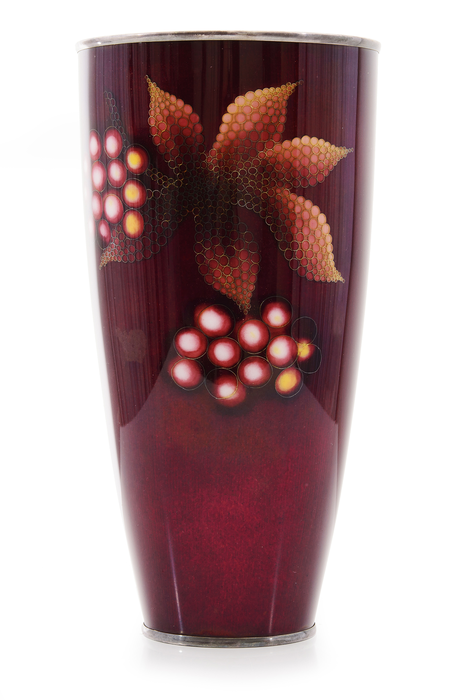 Of tall tapering form, silver rims and the pattern of fruit and flowers in gold and silver wire on an akasuke (pigeon or oxblood) enamel ground. Engraved mark of Ando co., 24.5cm high