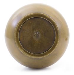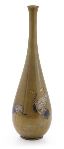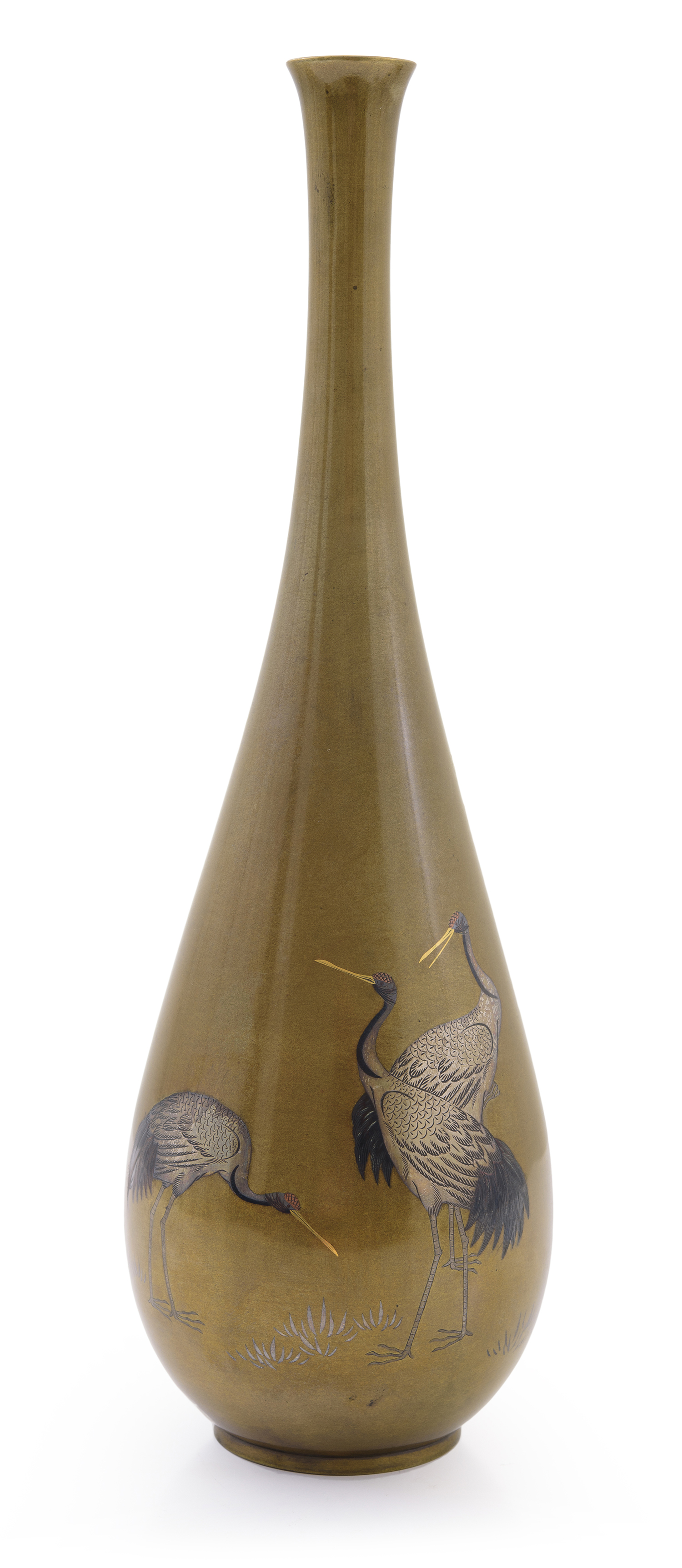 Exceptional quality and of tall oviform shape, with inlaid iro-e (coloured inlay) and silver hirazogan (low relief inlay) depicting a group of three Manchurian cranes, engraved feather details, 28 cm high