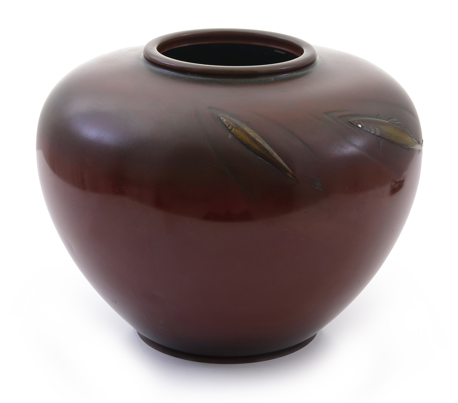 Fine quality with wide tapering body on circular base. The shoulder of the vase inlaid in half relief with two brass carp. (Silver eye). Incised mark to underside signed Hoshu, 16.5cm high