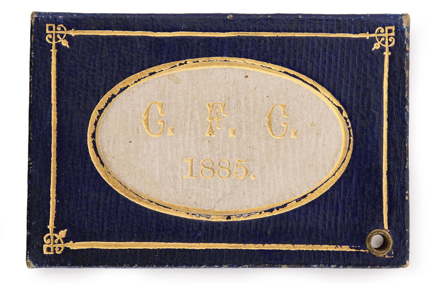 Covered in gilt tooled navy & cream leather binding. 7.6 x 5.1cm