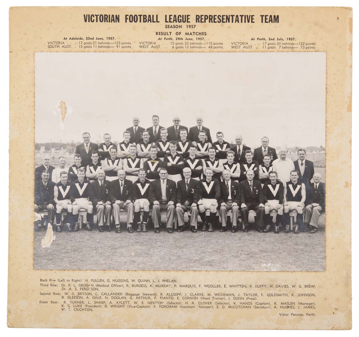 Crone however is best remembered for his time spent as the Carlton football club president from 1929-1937. Crone was also a Victorian selector for some years, most notably involved in the successful 1930 and 1933 Australian National Football Carnivals in Adelaide and Sydney.