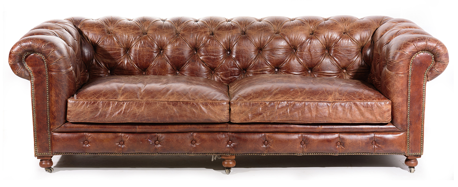 Traditional in design with buttonback back and sides, and brass stud detail to each arm, 88 x 238 x 90cm