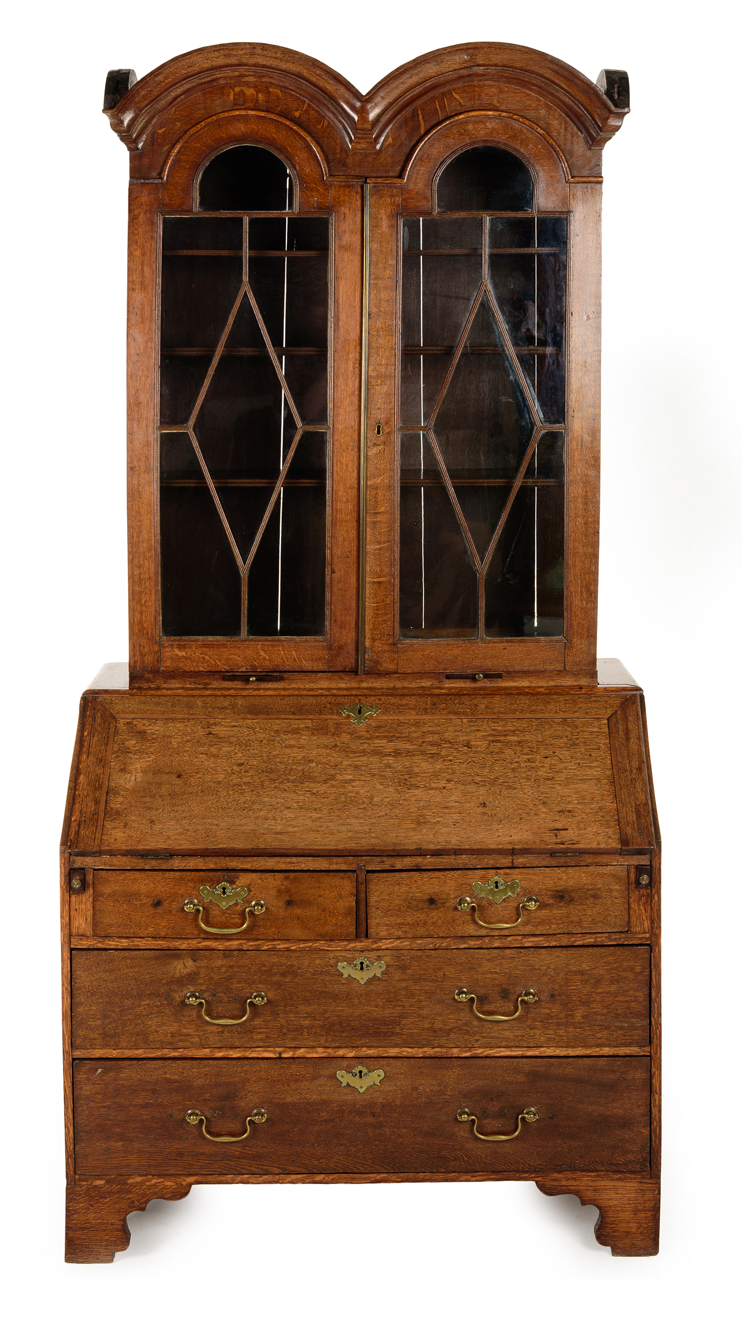 Double arched bookcase with astragal glazed doors above a four drawer bureau mounted on bracket feet.