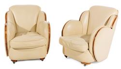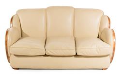 Comprising a three seater sofa and two matching armchairs, each with satin birch show wood to back and arms, upholstered in biege leather. The sofa 85 x 73 x 88cm