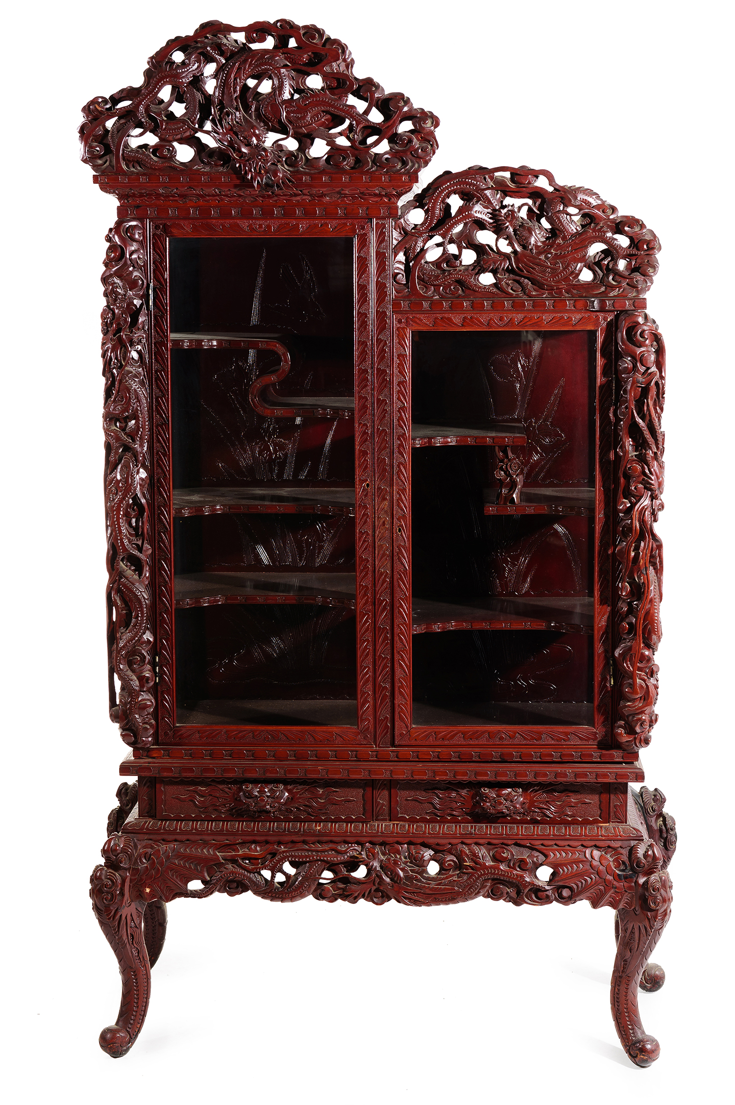 the heavilly carved and pierced pediment above a stepped body, with two drawers and two glazed doors opening to abstract shelves, the whole decorated in repeating dragon motifs, 202 x 113 x 46cm