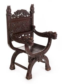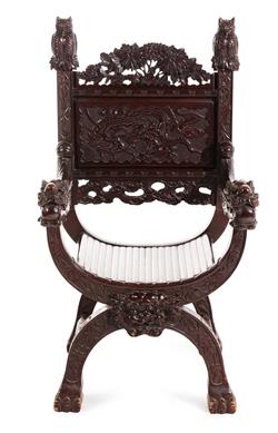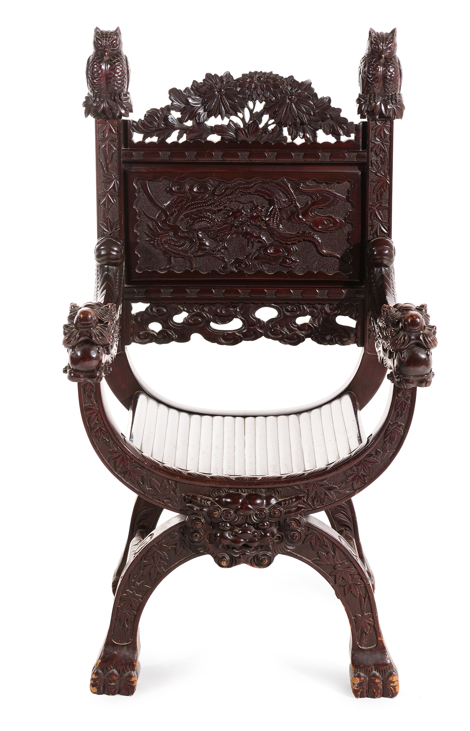 Elaborately carved overall, featuring owl finials above a detailed seat and back flanked by dragon handles, 107 x 63 x 62cm