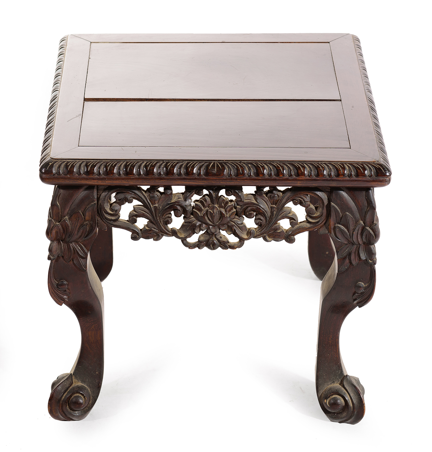 the square top with a gadronned rim, above a carved apron, rasied on tapering legs above scroll feet, 43 x 46 x 46cm