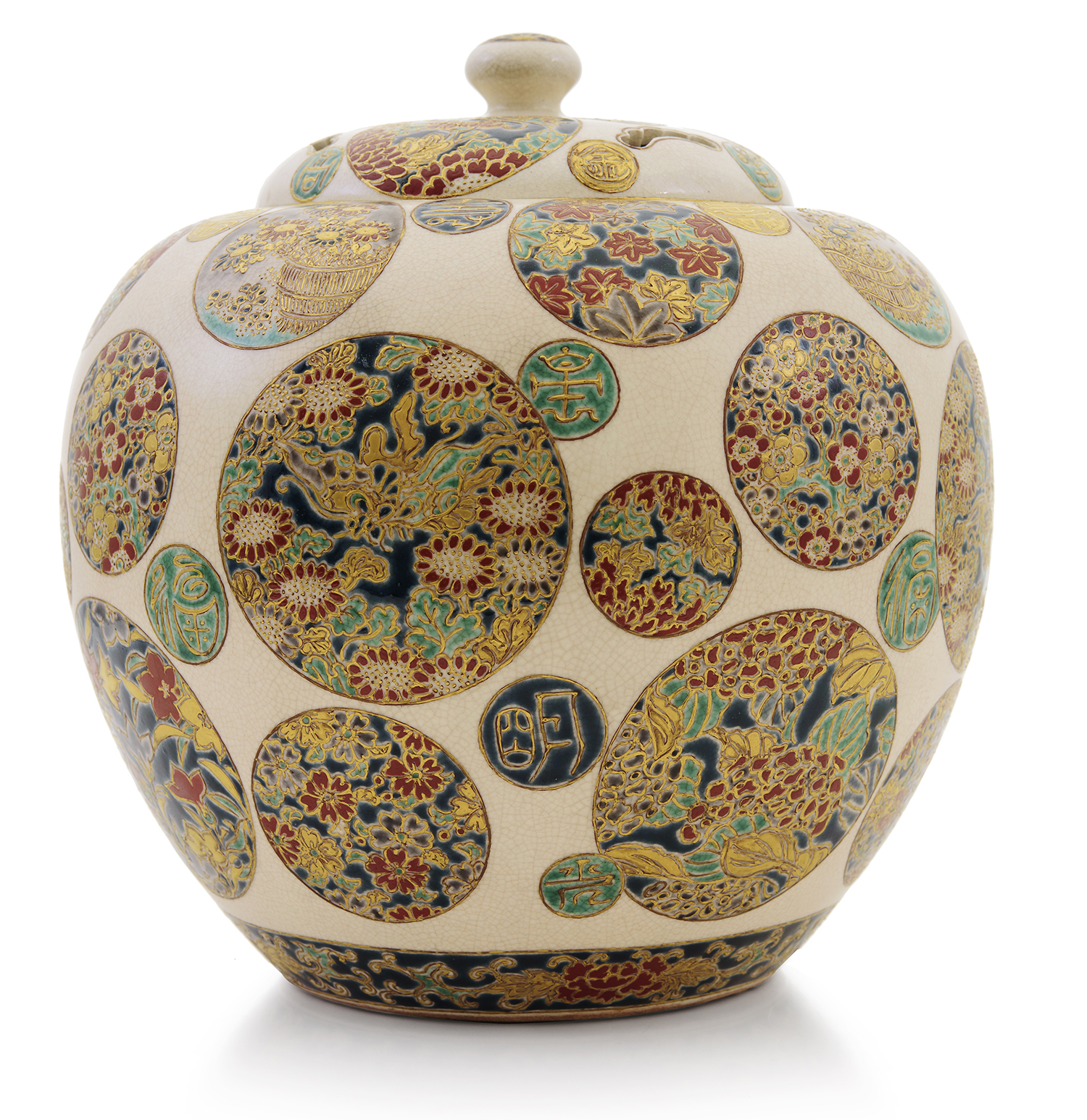 Of ovoid form decorated in polychrome enamels and gilt on a clear crackled glaze with an overall design of circular cartouche panels of flowers, Kanji characters with a further band of scrolling grasses around the base, the underside with the Shimazu family crest and signed Dai Nippon Satsuma Yaki Hyokoseki ga, 20.5cm high