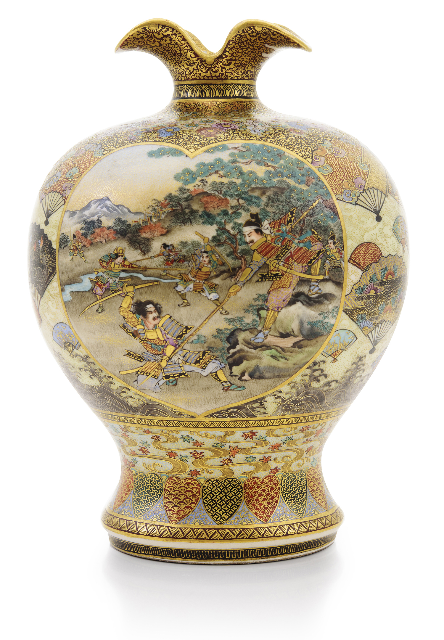 Double lipped with heart shaped figurative cartouches within falling fans, the base with heart shaped diapers signature below the Yasuda company trade mark and partial paper label, 17.5cm high