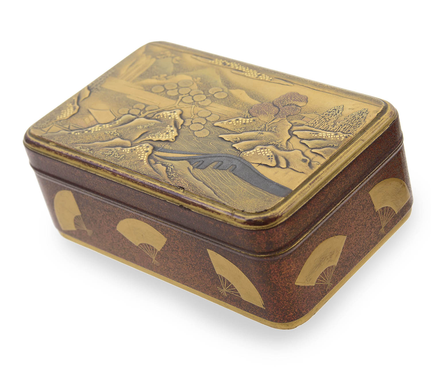 Rectangular lacquer box with main design of Mount Fuji, hillsides, river & bridge in a range of Maki-e (Sprinkled Picture) techniques including, Takamaki-e (high relief), Hiramaki-e (low relief), Togidashi, Nashiji and Kirikane, 4.5 x 12 x 7cm