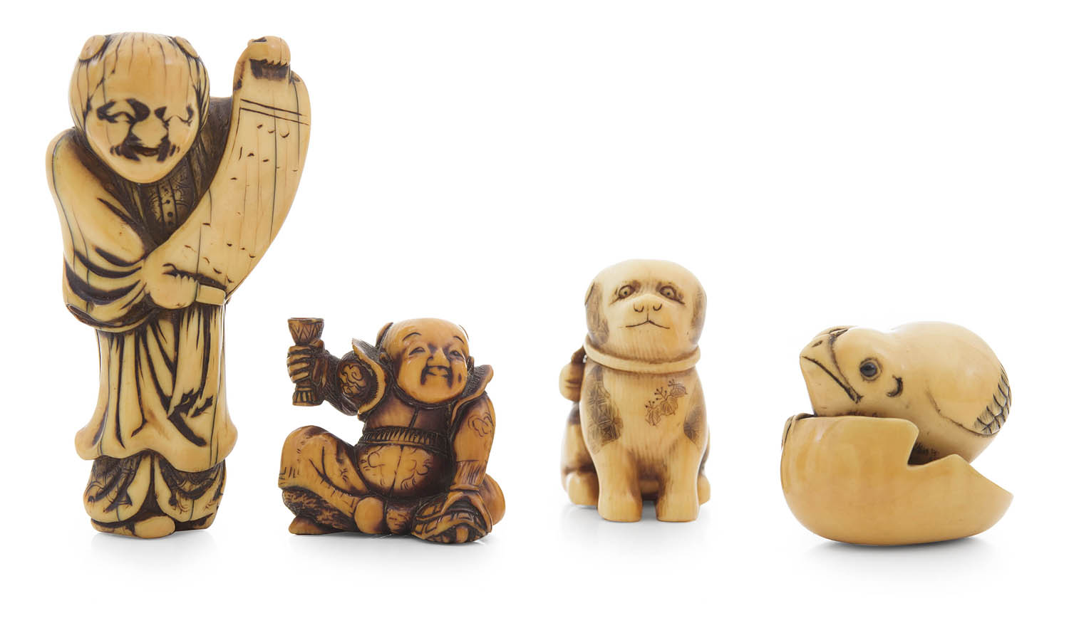The first a standing sage reading a scroll with age wear; the second of a merry reveller in stained ivory; the third of a puppy also in stained ivory and kiri decoration; the fourth, a chick breaking out of its egg. Various sizes. (4)